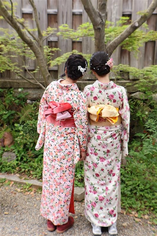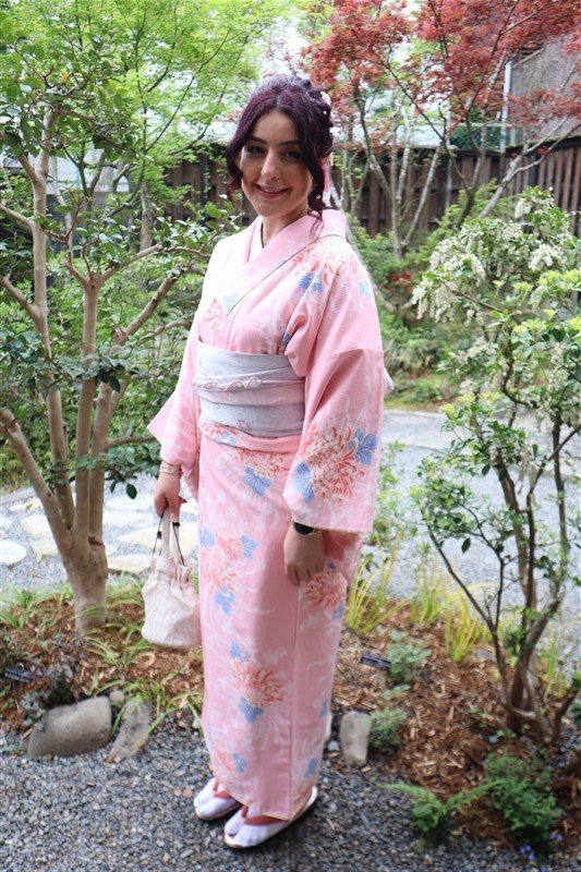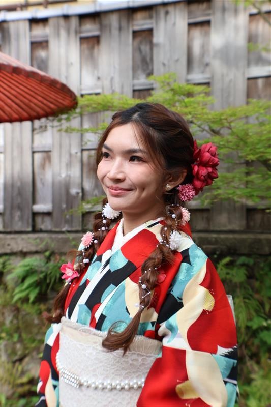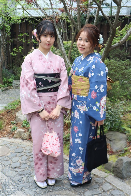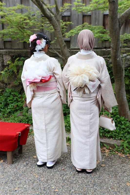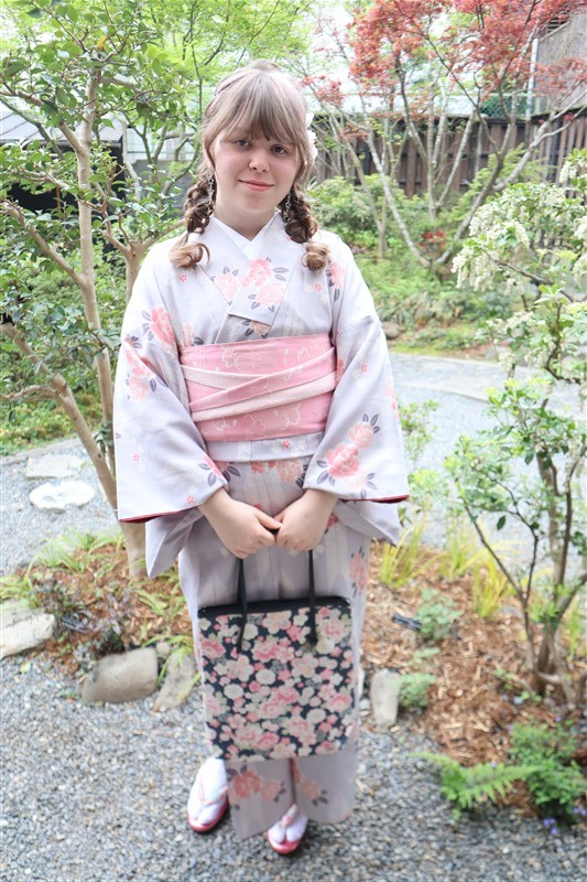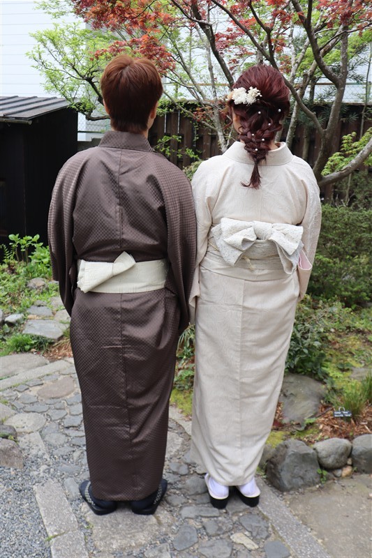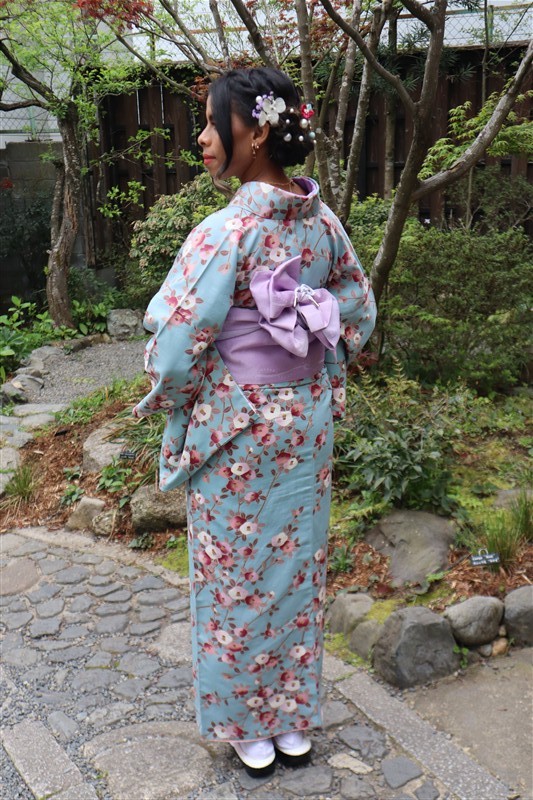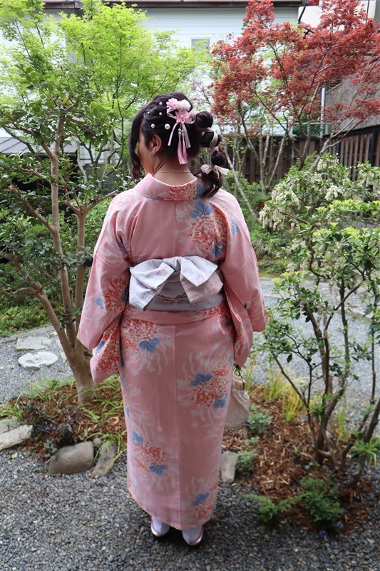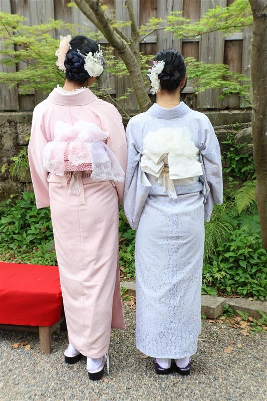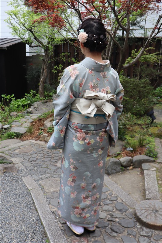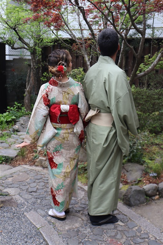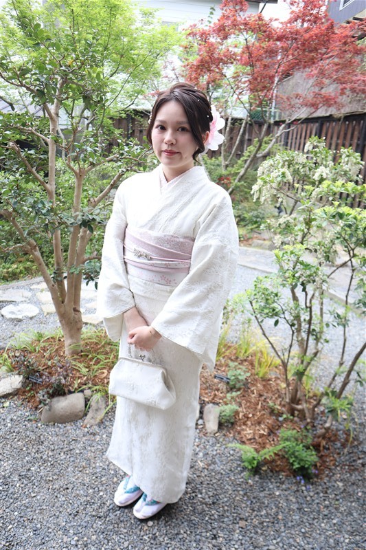 4月中旬から下旬にかけては、新緑が美しくなり始め、やわらかな緑と着物の色合いがとてもよく映えます。