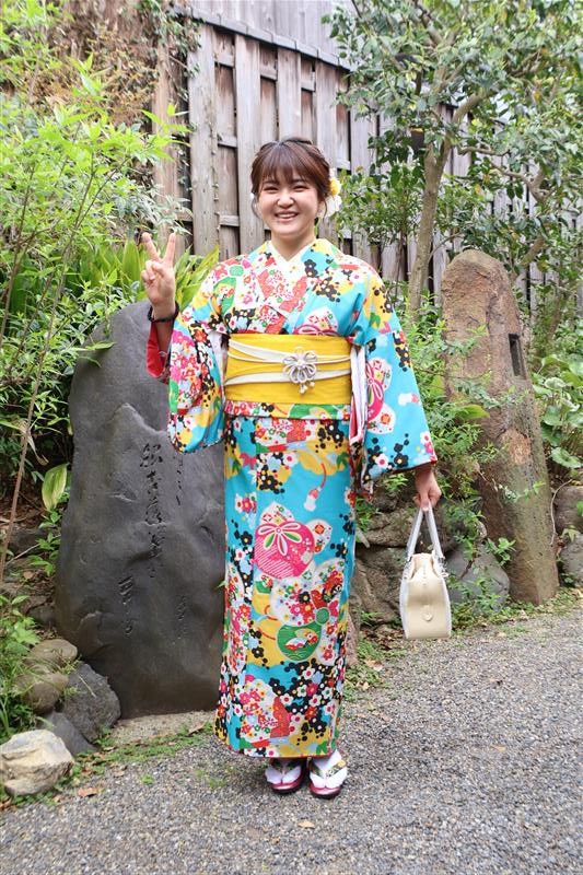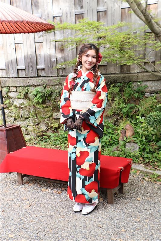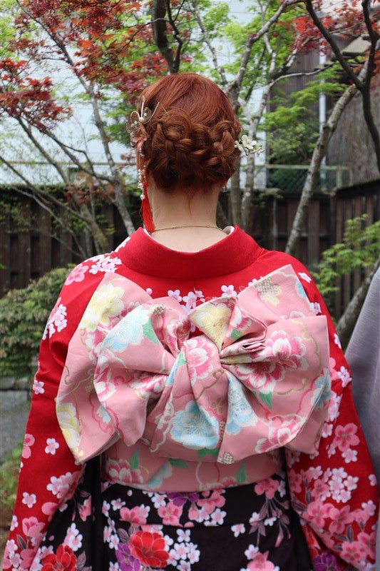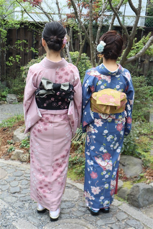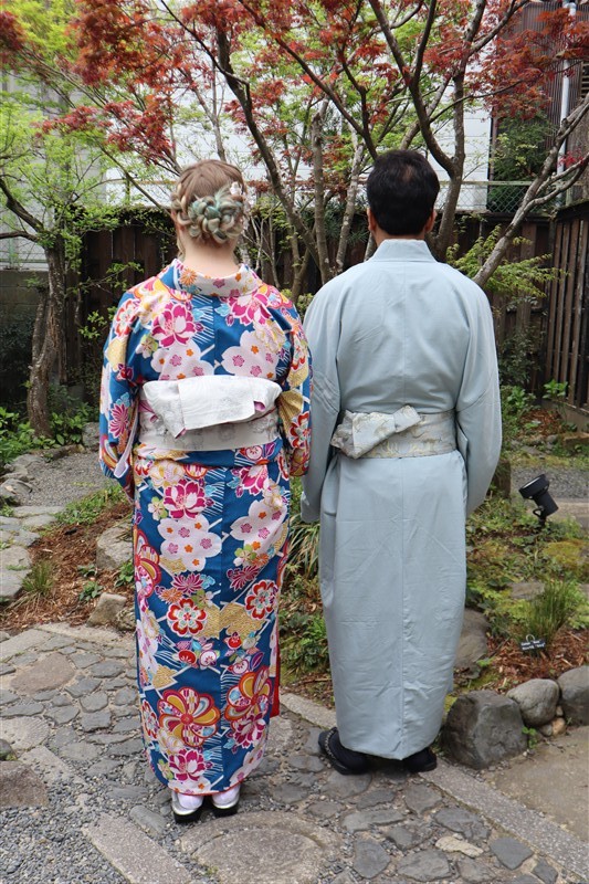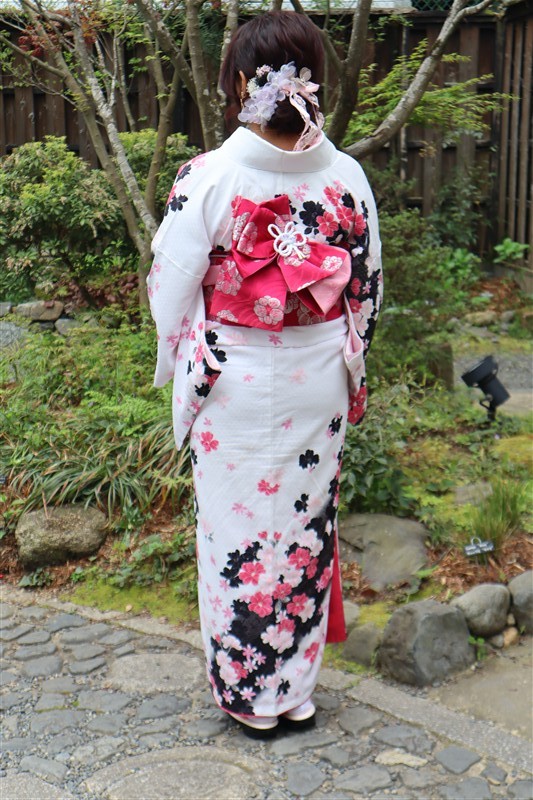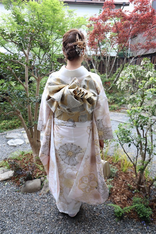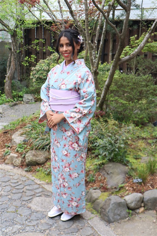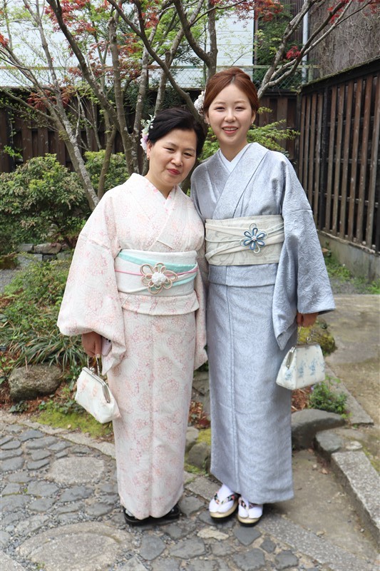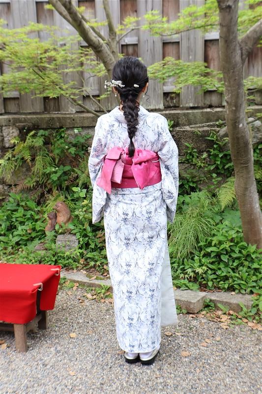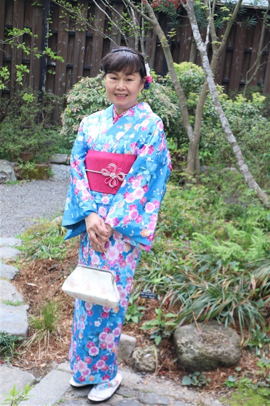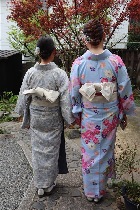 4月中旬から下旬にかけては、新緑が美しくなり始め、やわらかな緑と着物の色合いがとてもよく映えます。