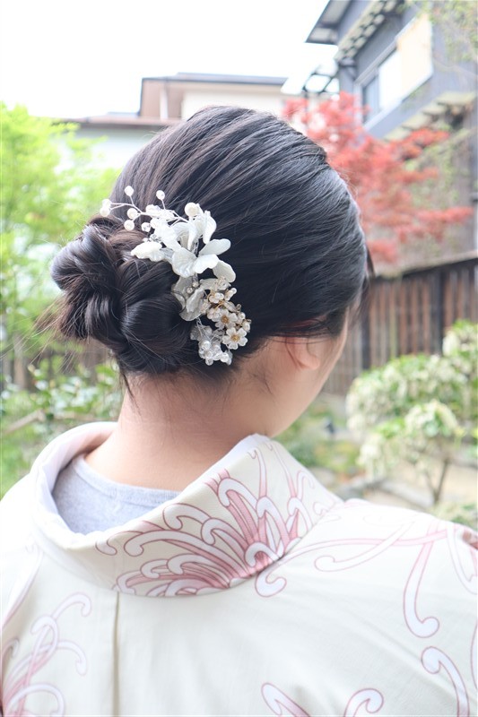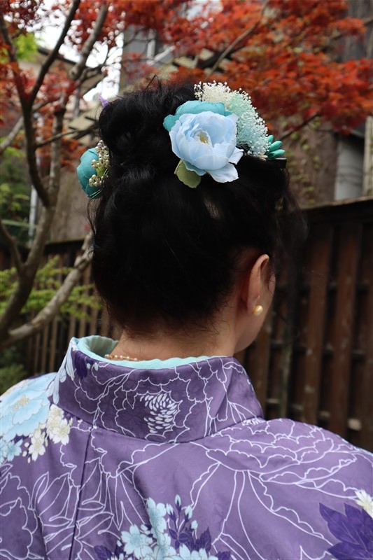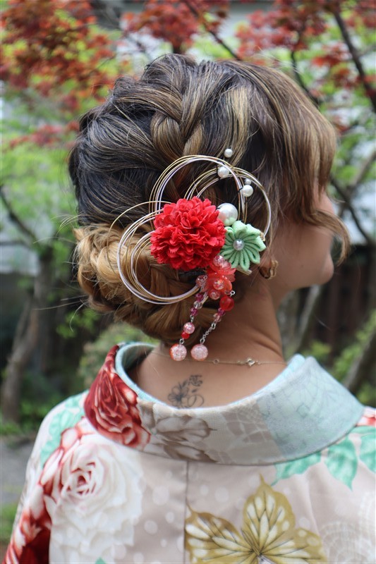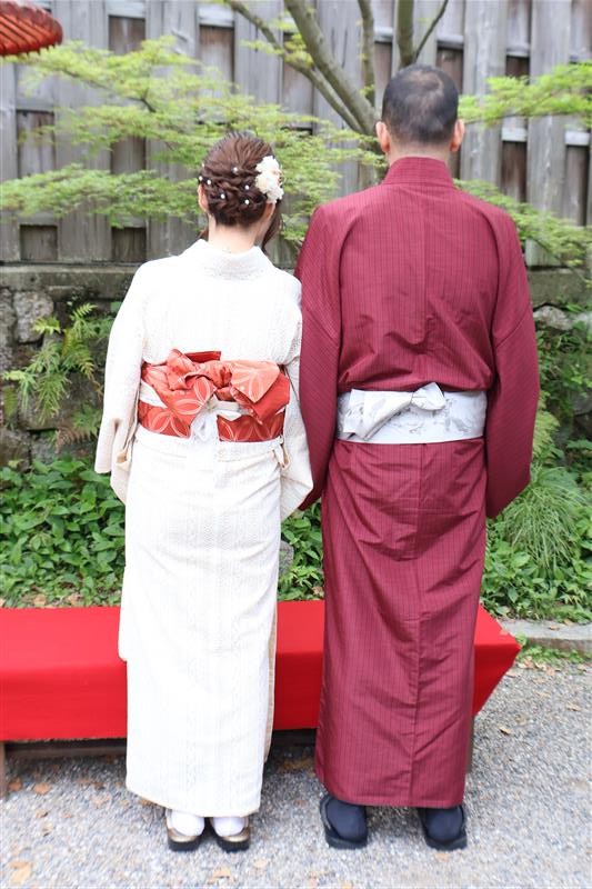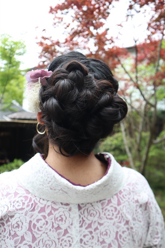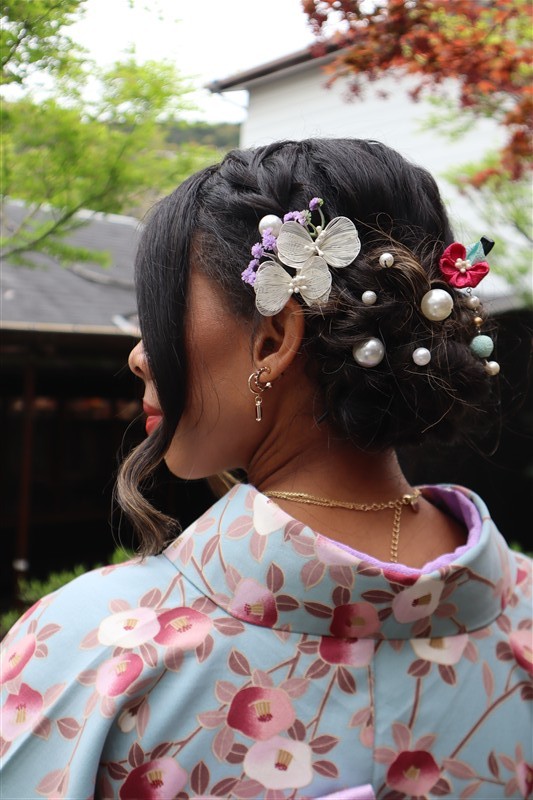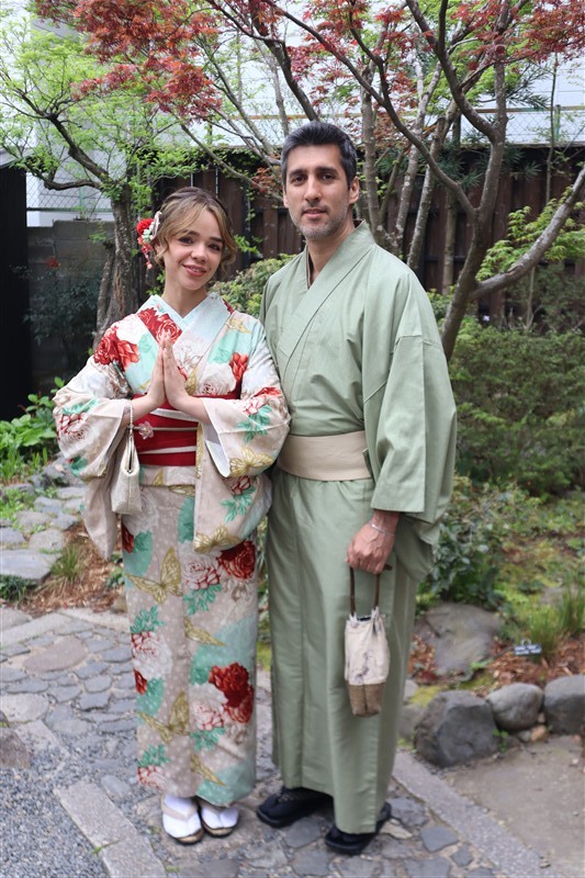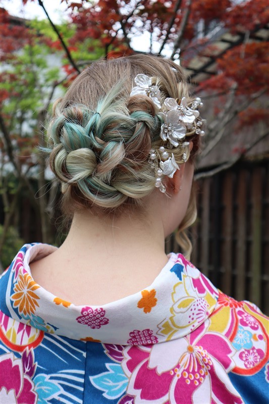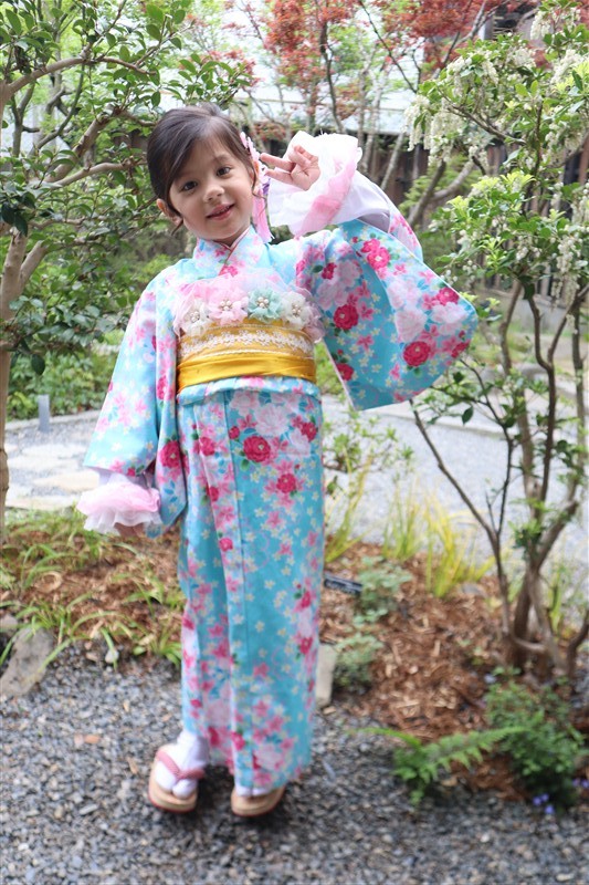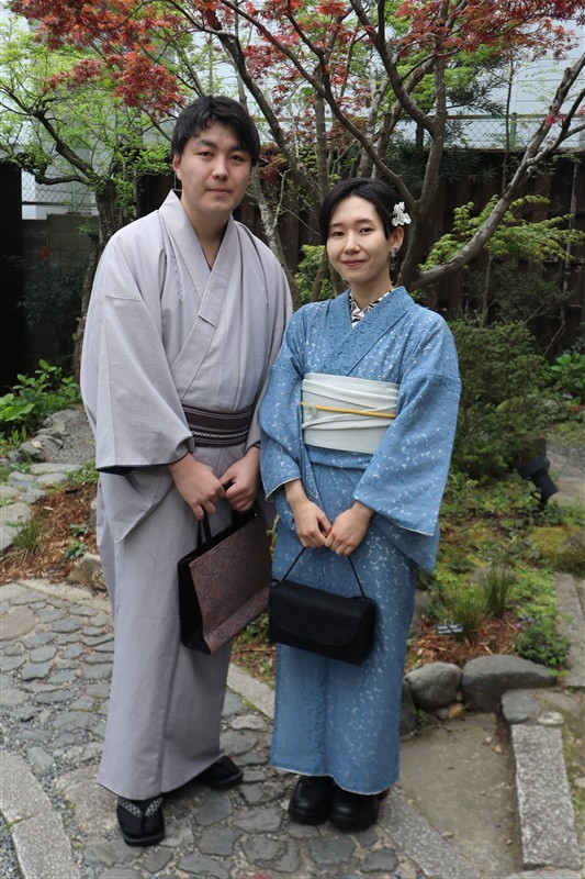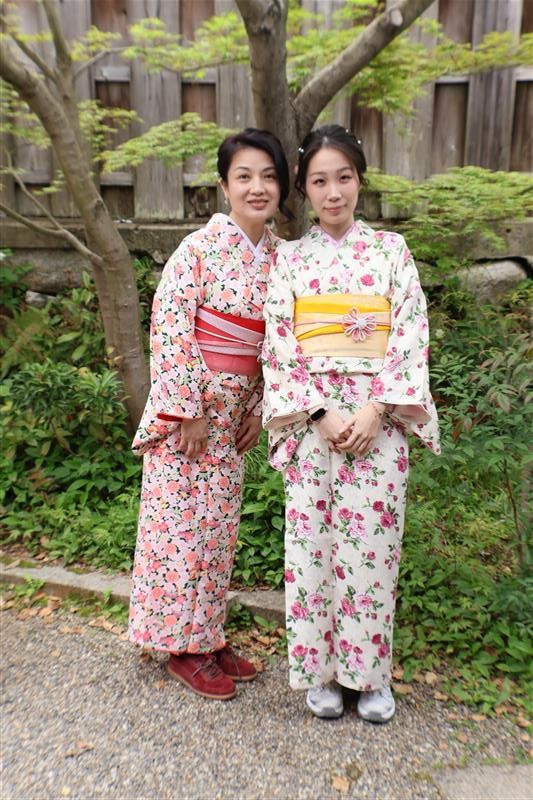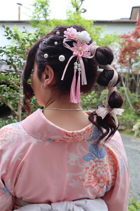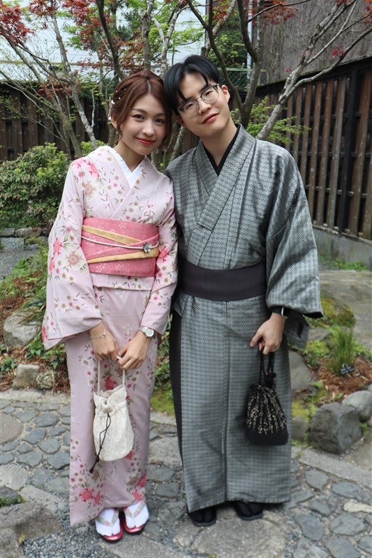 4月中旬から下旬にかけては、新緑が美しくなり始め、やわらかな緑と着物の色合いがとてもよく映えます。