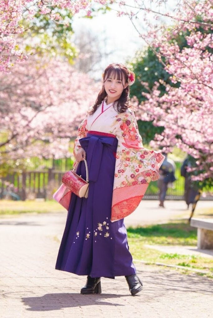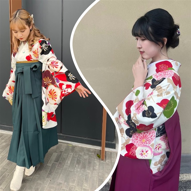梅の季節をより深く楽しみたいなら、ぜひ取り入れたいのが「梅柄の着物」。可憐に咲く梅の花と、着物に描かれた梅模様が自然と呼応し、歩くたびに景色の一部になるような一体感が生まれます。白地に映える赤やピンク、落ち着いた色合いの梅柄は、写真でも表情がはっきりと残り、梅巡りの思い出をより印象的にしてくれます。合わせる袴は、深みのあるグリーンや紫を選ぶことで、甘くなりすぎず、大人っぽい雰囲気に仕上がるのも魅力です。梅を「見る」だけでなく、「装いで楽しむ」梅巡りとして、梅柄の着物スタイルはとてもおすすめです。