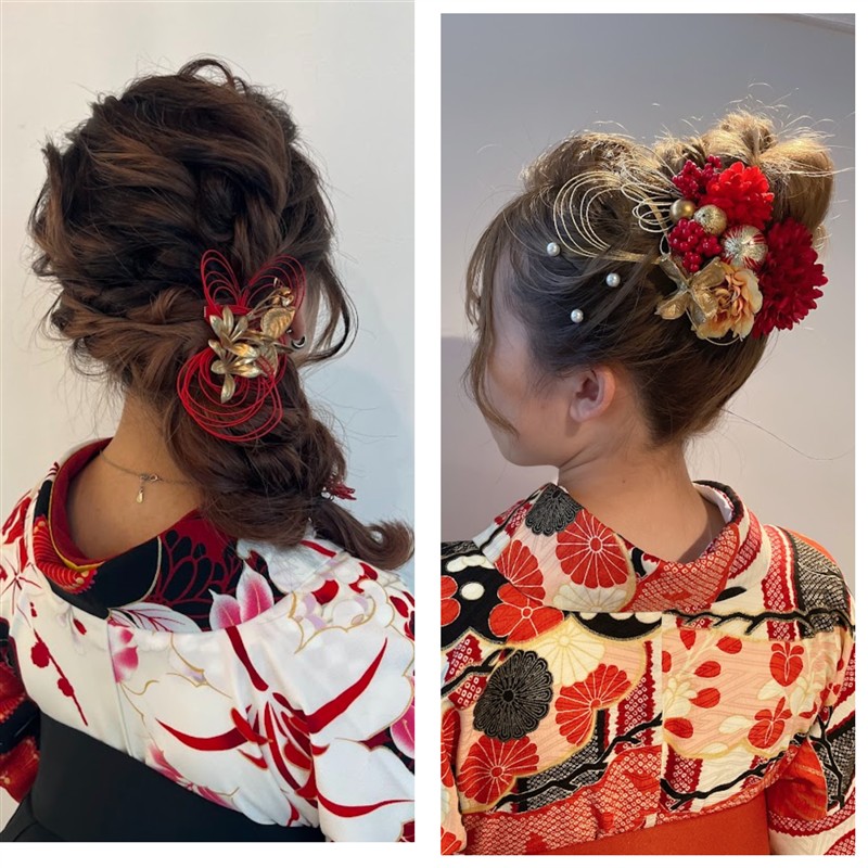 髪飾りは、梅をイメージして赤白はいかがでしょうか?梅巡りの装いに、そっと季節感を添えてくれるのが和のヘアアクセサリー。淡い冬から春への移ろいを感じる梅の花には、華やかすぎず、それでいて品のあるデザインがよく似合います。写真のような赤を基調にした水引きや、つまみ細工や小花モチーフは、咲き始めの梅の可憐さと重なり、後ろ姿まで印象的に演出してくれます。また、金のラインやパールのあしらいが入ったアクセサリーは、光を受けて控えめにきらめき、着物姿に奥行きをプラス。まとめ髪に一点添えるだけで、梅園のやわらかな景色と調和し、写真映えもぐっと高まります。