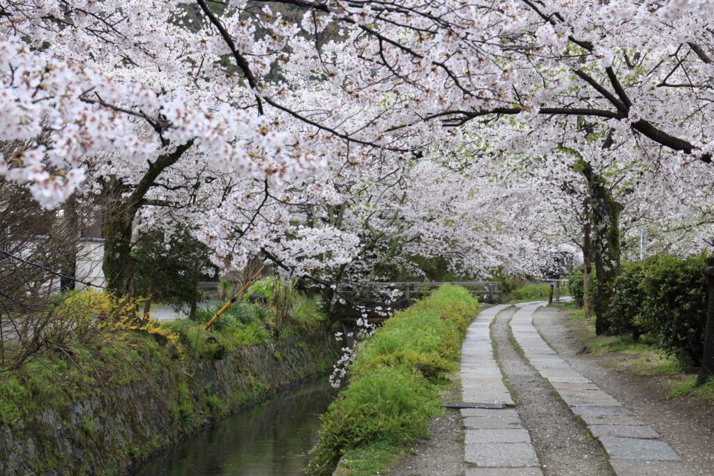 哲学の道は琵琶湖疏水に沿って約2㎞にわたって小径が続いており、銀閣寺から南禅寺までおよそ400本の桜並木が続いています。