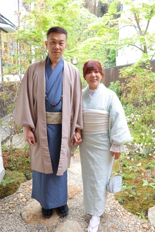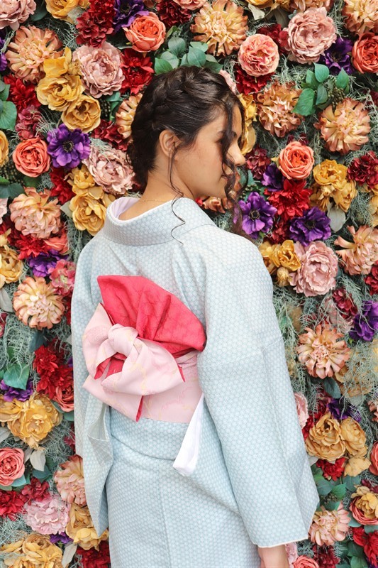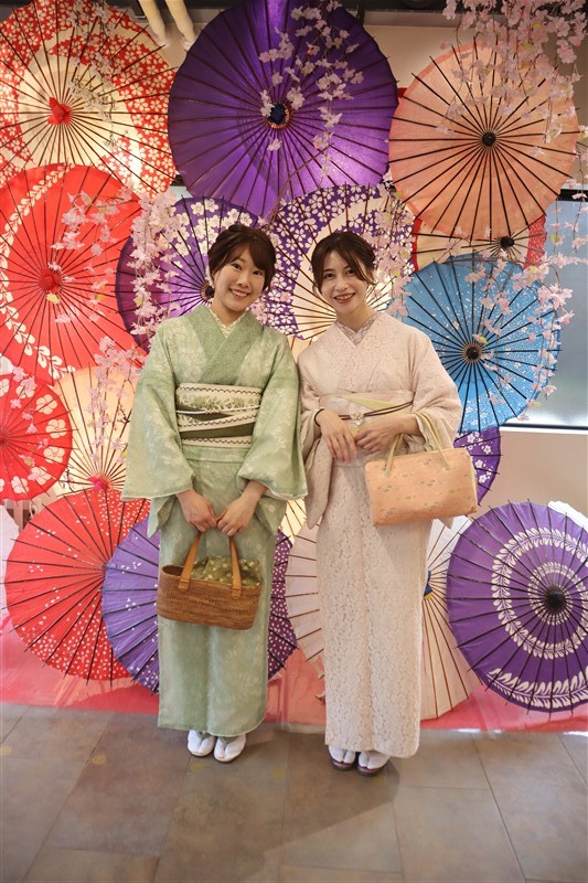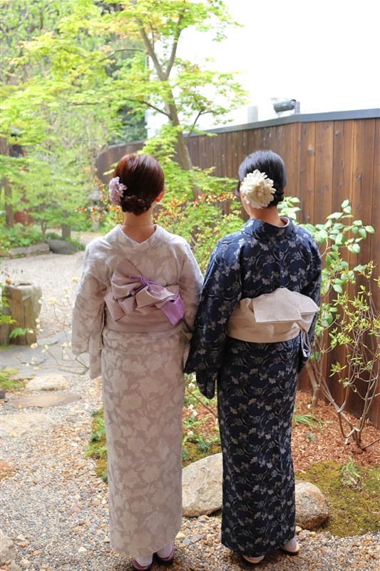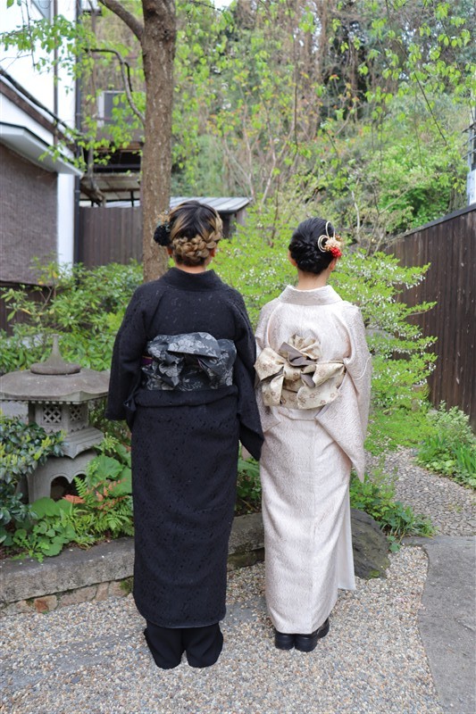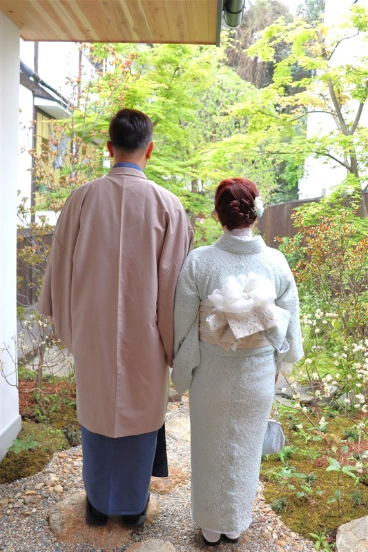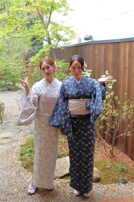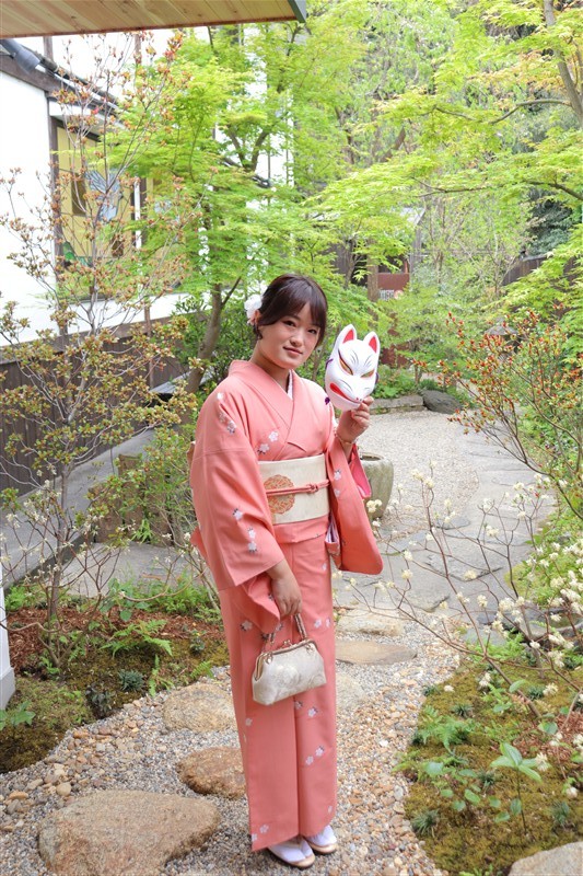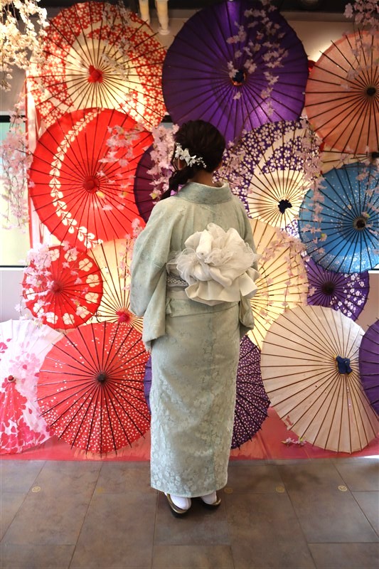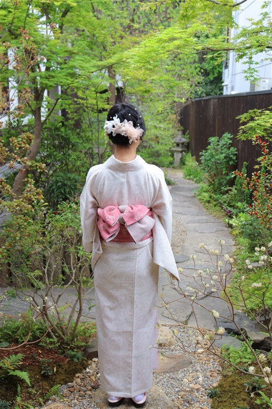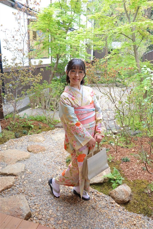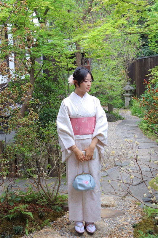 4月中旬から下旬にかけては、新緑が美しくなり始め、やわらかな緑と着物の色合いがとてもよく映えます。